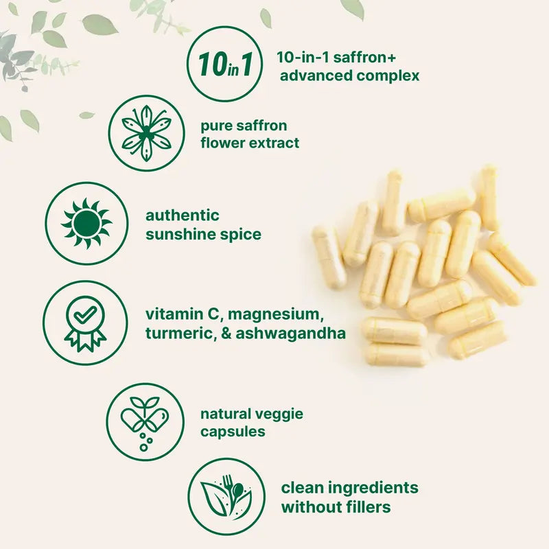 It’s a 10-in-1 advanced supplement that combines saffron, adaptogens, calming herbs, and essential nutrients to support mood, focus, stress relief, and overall wellness.*
